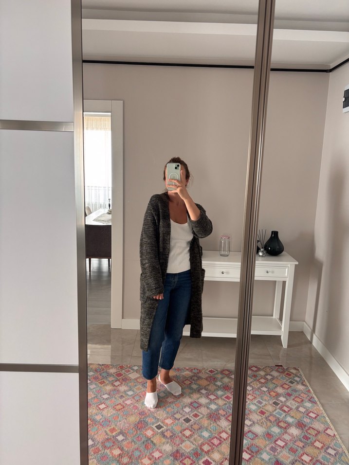 1 kere kullanıldı. Yeni ve temizdir. Günlük kullanıma uygun, zahmetsiz şıklık sunar. Yün hırkadır, mont gibi sucak tutuyor.