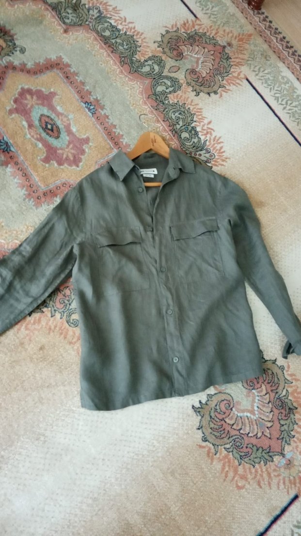 Gri keten gömlek, uzun kollu ve düğmeli. Salaş kesim, normal boy ve yakalı, günlük rahat stil için uygun. Rengi haki- gri arası bir ton. İlk fotoğraflardaki rengin 1 ton koyusu gibi. Çok şık bir duruşu vardır.