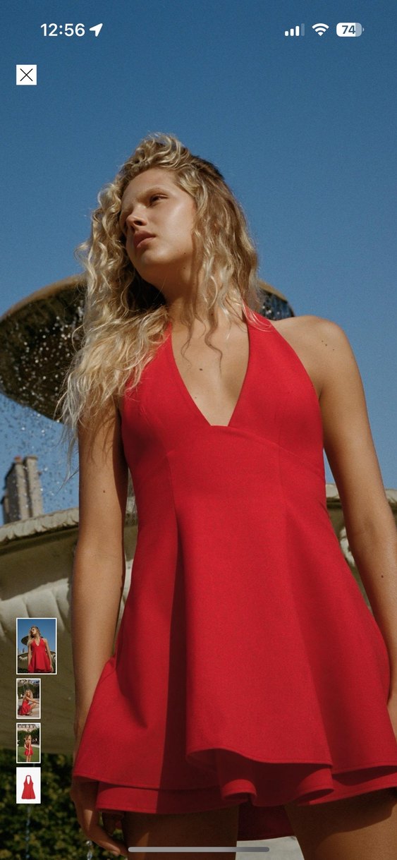 Halter yakalı ve V yakalı kısa elbise. Kombine iç astar. Yan dikişte gizli fermuar kapamalı. Kırmızı renkte