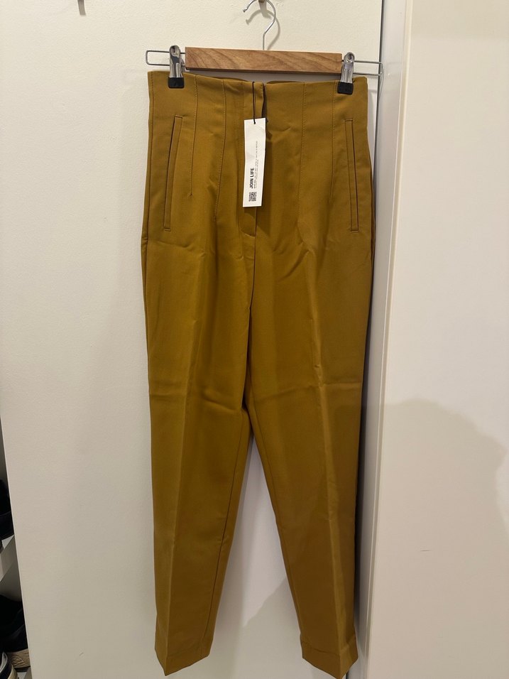 Zaranın klasik ,piliseli , yüksek belli, hardal renkli kadın kumaş pantolon. Ofis ve günlük sokak stiline uygun, düz ve rahat kesim.