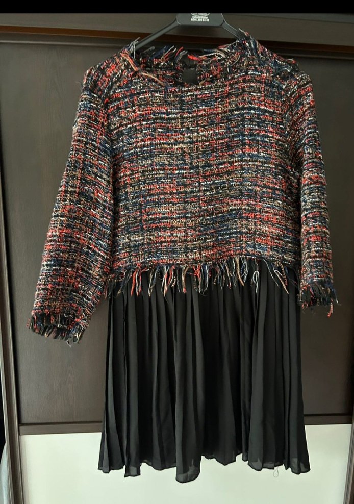 Orijinal Zara Elbise, üstü tüvit kışa uygun, altı pileli kısmı 45 cm, Elbise boyu 85cm kol 43 cm, koltuk altından koltuk altı 46cm, çok tatlış bir Elbise hemde şık, hem stiletto hem çizme, hem bot kombini, XS/S/M bedene olur üstü kalın olmayan L bedene bile olur, rahat kesim altı pileli olduğu için