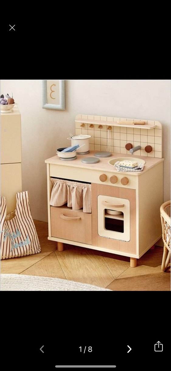Defoları ekledim, ne görüyorsanız o gelir demonte edemem silikonla yapıştırmıştım vida yerlerinden. ……Pastel bej renkte çocuk oyun mutfağı seti, ocak, fırın, lavabo ve kumaş perdeli depolama alanı ile hayal gücünü destekler.