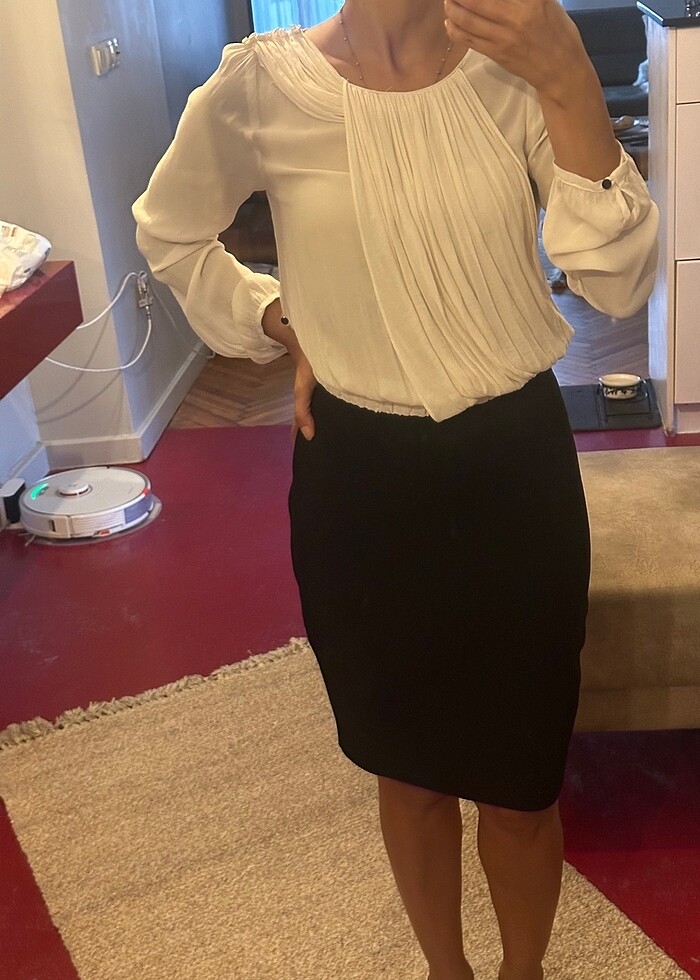 Zara marka üst ekru pile detaylı bluz, siyah kalem etek arkada yırtmaçlı birleşik elbise. Çok şık, hem ofis hem özel günler için kurtarıcı bir parçadır