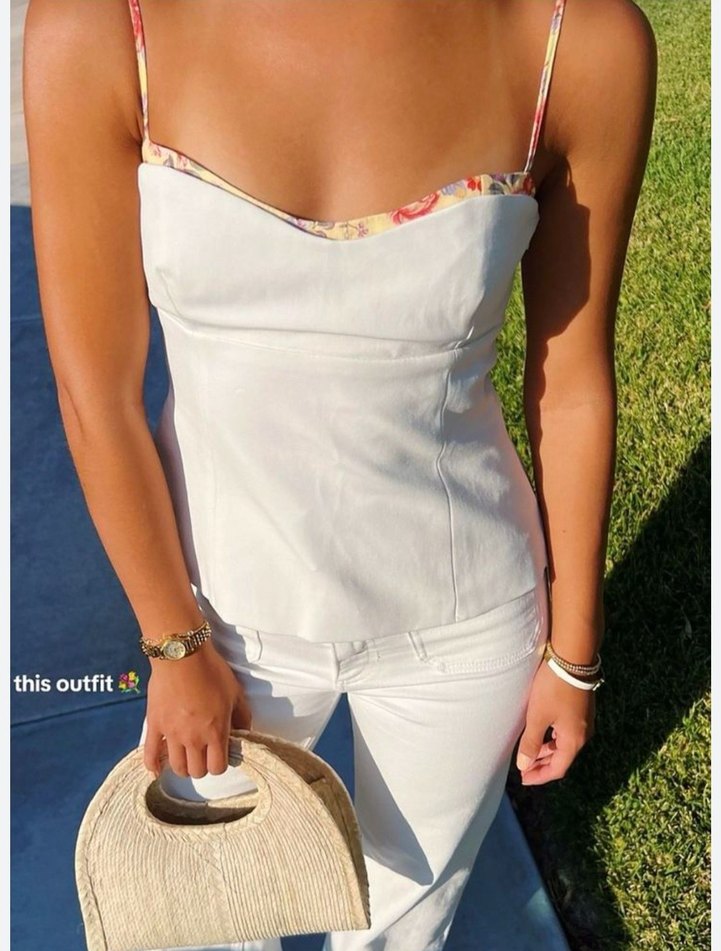 Suni kumaştan yapılmış, zincir detaylı ve bağlama desenli askılı, beyaz mini bustiyer. Sokak modasına uygun, vücuda oturan kesim.