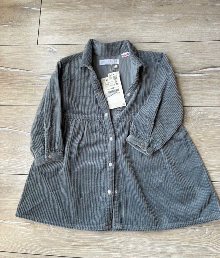 kadife kumaştan yapılmış, uzun kollu, düğmeli ve yakalı kız çocuk elbisesi. Rahat kesimi ve baskılı dokusuyla gündelik kullanıma uygundur. Ürün orijinal zara mağazasından alınmıştır. Fakat kullanılmadı. Sadece son fotoğrafta gösterildiği gibi biraz renk ve doku değişimi var, nedenini bilmiyorum. Belki yıkayınca geçebilir. Bu nedenle uygun fiyatlıdır. Rengi füme - indigo gibidir.