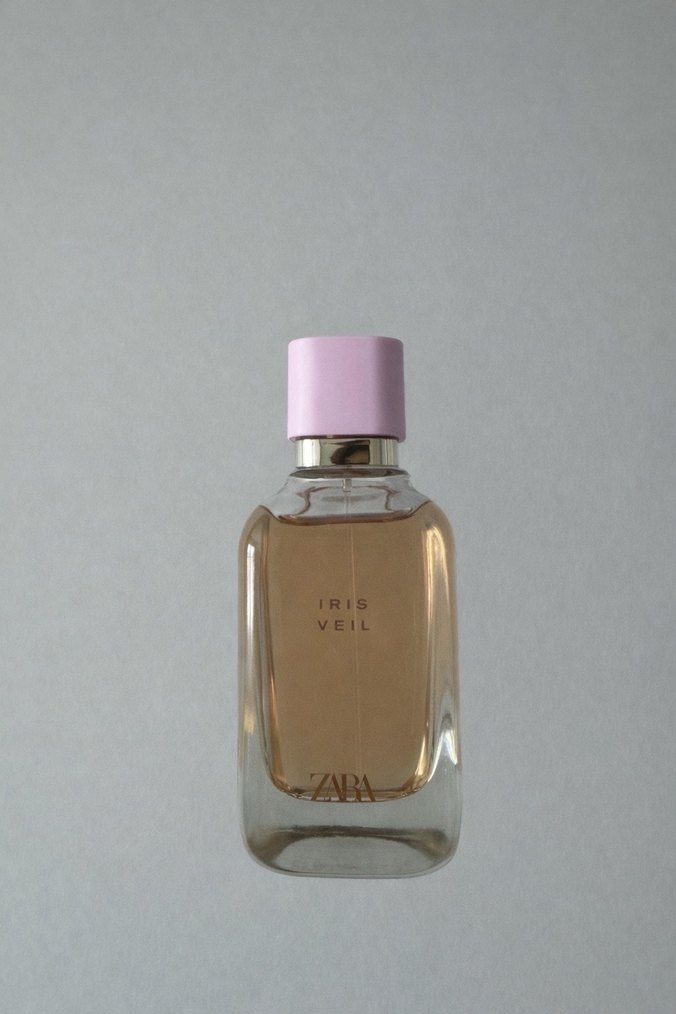 Zara Iris Veil kadın parfümü, şeffaf şişede ve yumuşak pembe kapaklı, zarif ve hafif bir kokuya sahiptir.