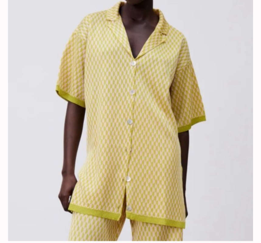 Sarı pastel renkte, V yakalı, düğmeli, bol kesim kısa kollu kadın gömleği. Günlük rahat sokak stili için uygundur. Zara Jakarlı örgü gömlek