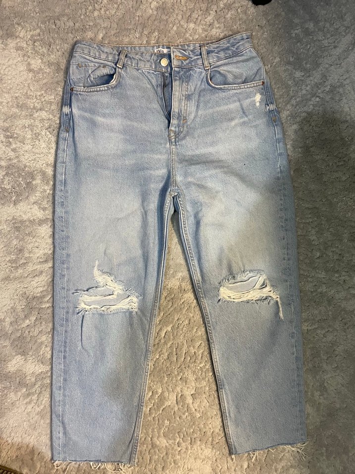 zara buz mavisi dizleri yırtık jean hiç kullanmadım büyük olduğu için 38 beden yazıyor ama 40da olur sadece paçalarını kestim ölçüleri zaten görselde var