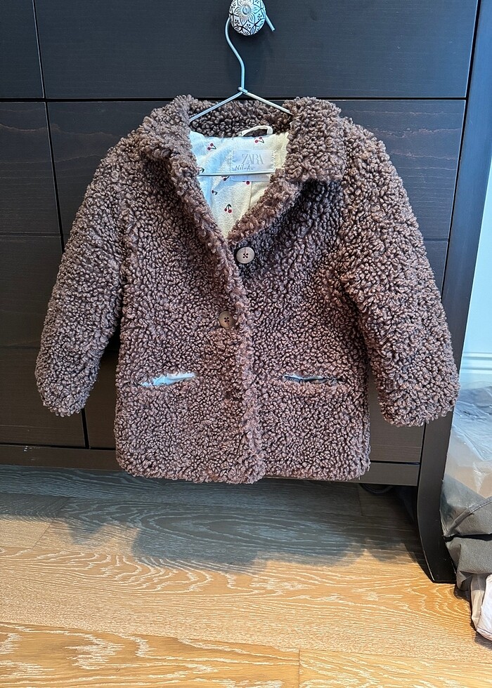 Çok tatlı kahverengi tüylü kaban, iç astarında ofak iki leke var ama yıkamadım bilerek alan kişi yıkar zaten iki kere boşuna yıkanmasın diye. En alt düğmesi eksik.