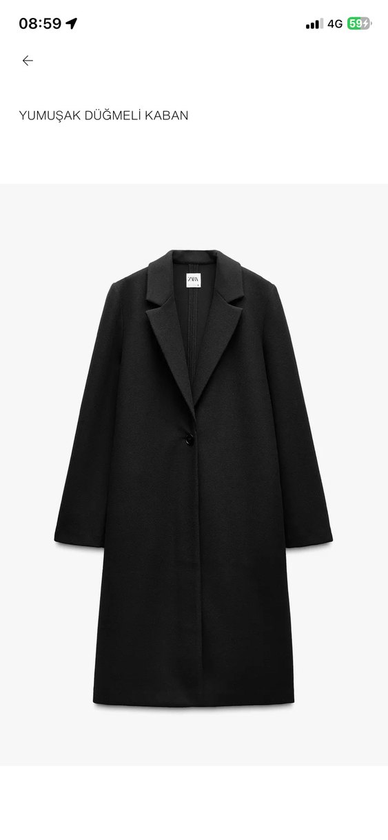 Tek düğmeli uzun kaban. Sayılı giyildi. Kumaşı yumuşak