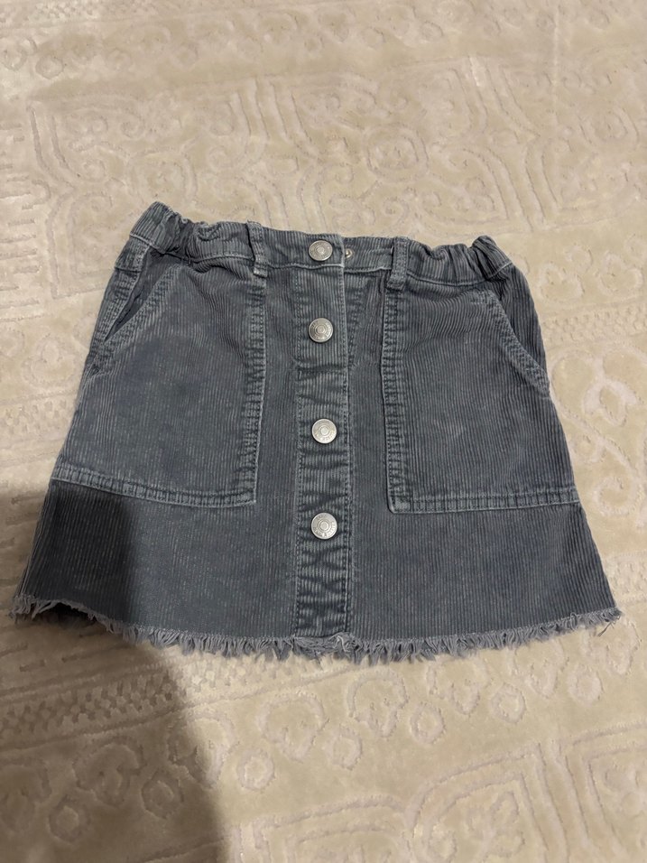 Kız çocukları için düğmeli ön ve yan cepli, fitted kesim gri denim etek. Alt kısmı hafif püsküllü detayı var. Yeni gibidir.