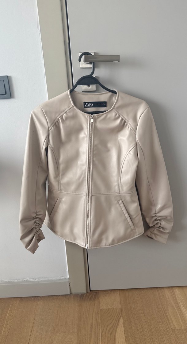 Bej renkli, fermuarlı, uzun kollu, kısa kesim ve dar kesim kadın deri ceket. Günlük sokak modasına uygun sade tasarım.