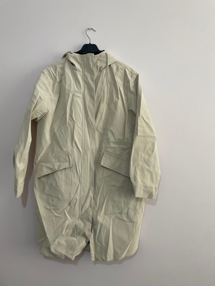 Bej renkli midi boy su geçirmez trençkot, bol kesim ve uzun kolludur. Minimalist tarzı günlük kullanım için uygundur. Notlu yaka detayı bulunur. ☔