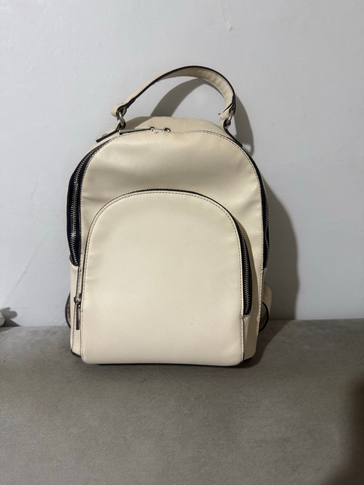 Fermuarlı bölmeleri olan beyaz deri sırt çantası, sade ve minimalist tasarıma sahip, günlük kullanım için uygundur.