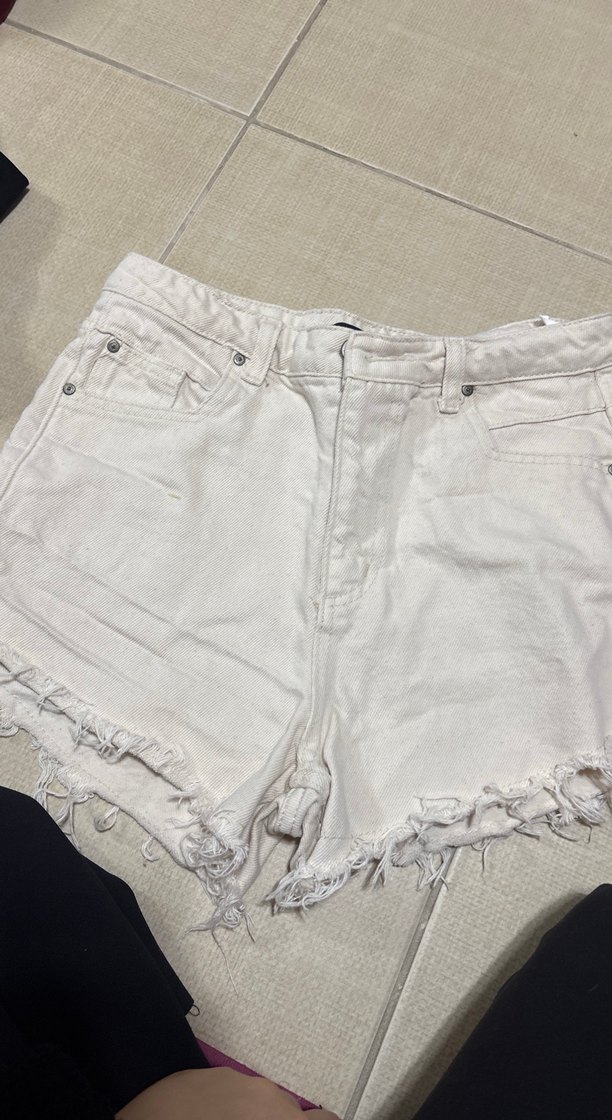 Beyaz mini denim şort, bol kesim ve yırtık detaylı, rahat ve şık. Günlük sokak stili için uygundur.
