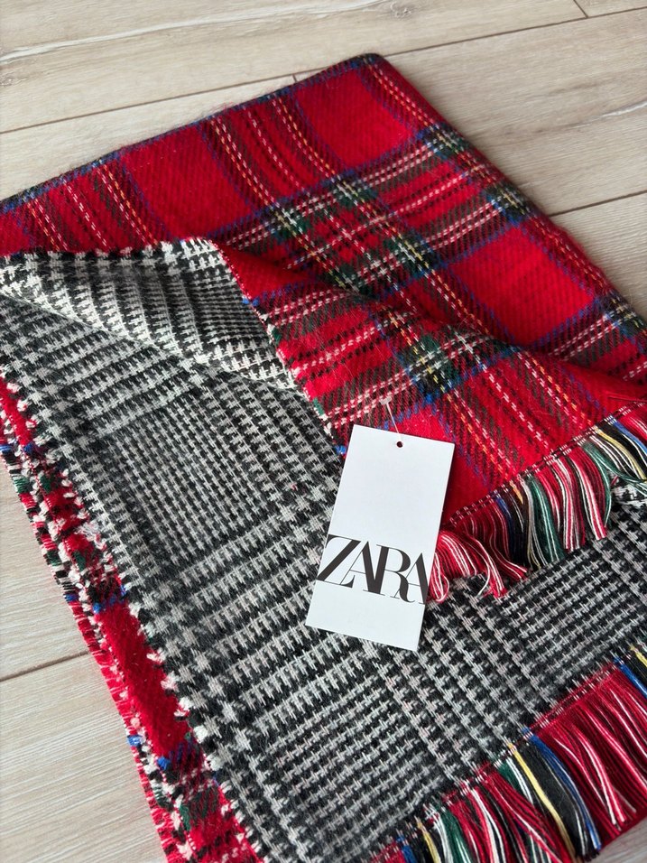 Zara kadın şal, örgü tekstilden yapılmış ve bohem tarzda. Canlı kırmızı ve gri renkler, kareli desenler ve püsküllü kenarlarla rahat, retro bir görünüm sunar.