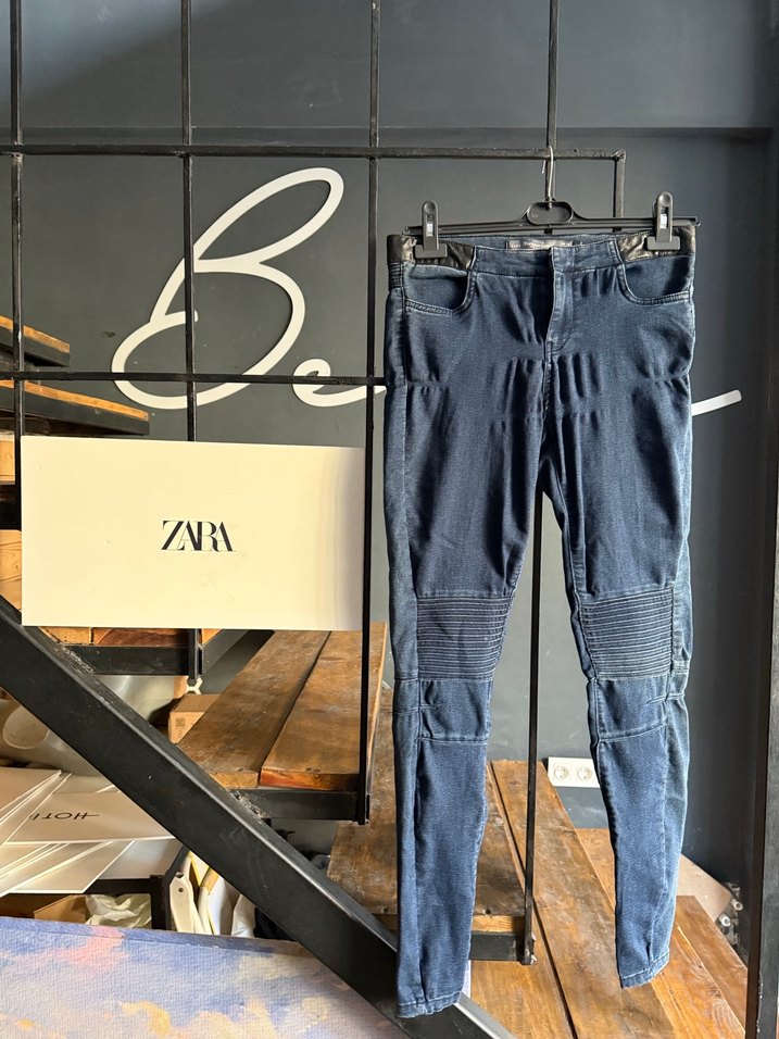 Kualnımdan dolayı defolar var resimde mevcut ben öyle kullnıodum giyince farkedilmiyordu fiyatı makul yazdm Zara'dan bel kemerli, biker tarzı, fitted kesim midi uzunlukta kadın denim pantolon. Günlük kullanım için uygundur.