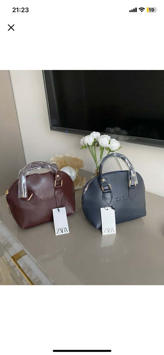 Zara kadın deri çanta, modern klasik tarzda, fermuarlı ve baskılı desene sahip. Kahverengi ve gri renk seçenekleriyle klasik zarafeti günlük kullanıma uygun şekilde sunar. 'ARI' detaylı, sapları korumalıdır.