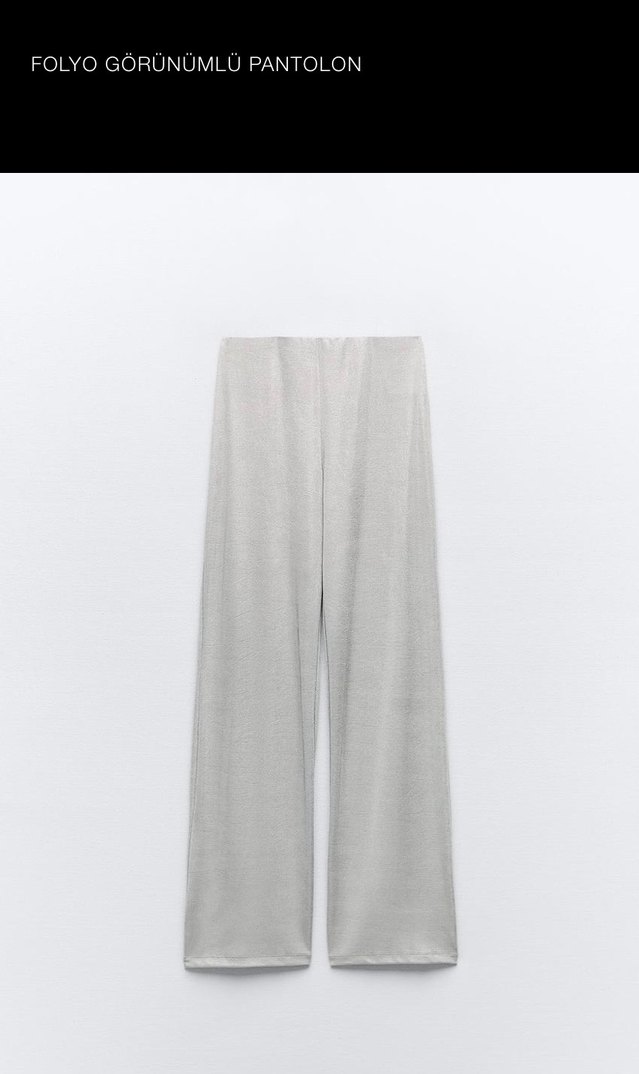Gümüş parlak.S beden.Zara marka.Hiç giyilmedi.Gri keten kumaştan, normal kesim ve midi boyda kadın pantolon. Minimalist ve normcore tarzıyla sade ve şık bir görünüm sunar. Günlük kullanıma uygundur.