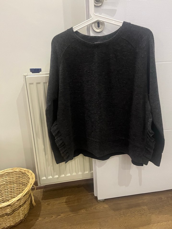 Füme rengi yün iki yanları yırtmaçlı fırfırlı kazak deforme yoktur