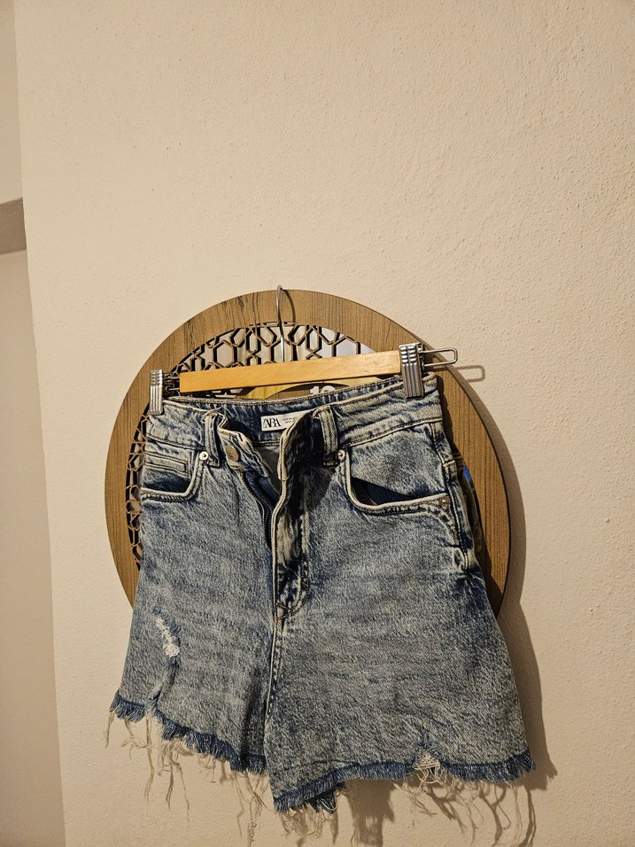 Gri renkte, bol kesim ve tokalı detaylı mini kot şort, günlük kullanım için uygun rahat bir sokak stili.