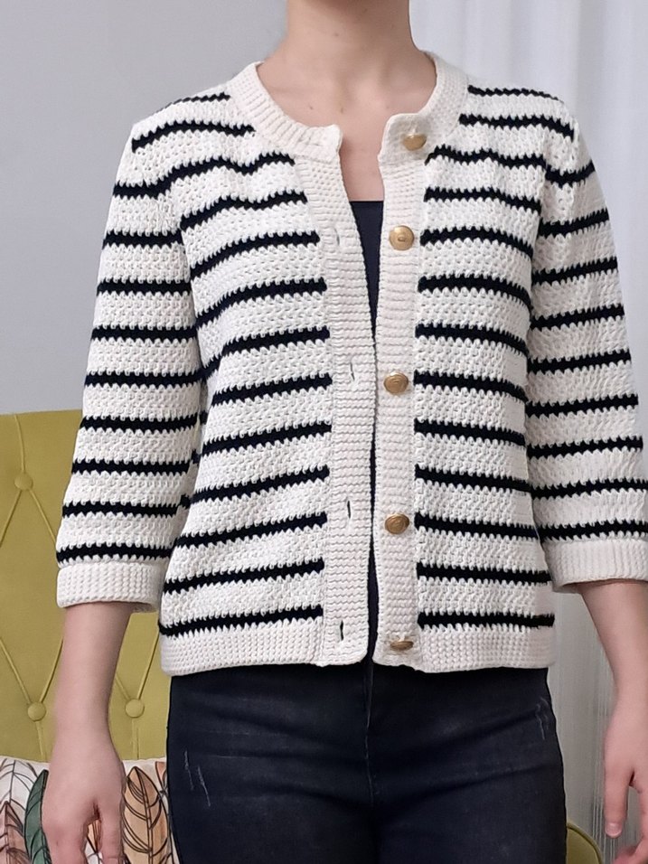 Düğmeli, yuvarlak yakalı, yarım kollu, krem siyah çizgili zara örme hırka. l beden ama 1.62 boy 50 kg bende iyi duruyor
