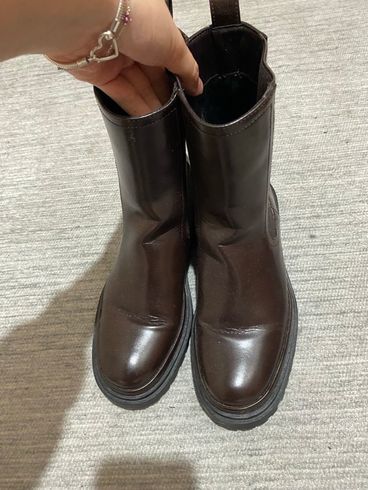 Koyu kahverengi deri kadın botlar, blok topuklu ve tokalıdır. Minimalist günlük kullanıma uygundur, desen içermez.Tertemiz ürün 2 kez kullanıldı sadece zaranın bu botlarında katlanma izi her türlü oluyor zaten tek kullanımda bilen bilir tertemiz ürün kaçırmayın derim