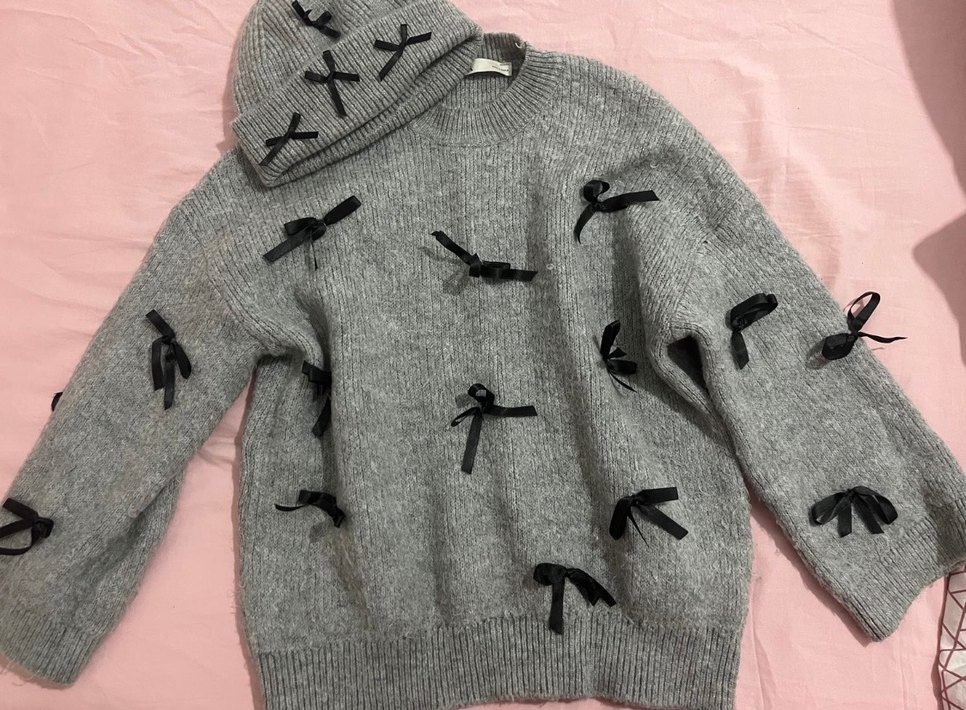 Gri örgü kumaştan, bol kesim ve işlemeli siyah fiyonk detaylarıyla rahat ve şık kadın kazak.