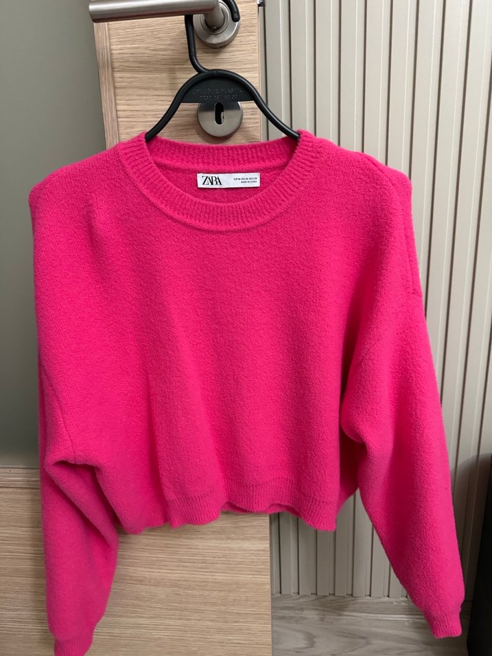 Pembe renkli, yuvarlak yaka, örgü mini kadın kazak. Bol kesim ve uzun kolludur, yumuşak ve sıcak kumaştan yapılmıştır. Sayılı kullanılmıştır tertemiz
