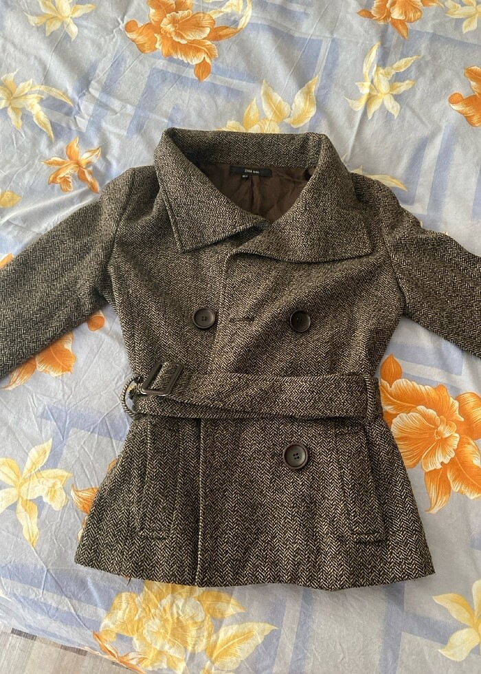Kısa kaban ic astarinda yirtik var kahverengi krem rengi