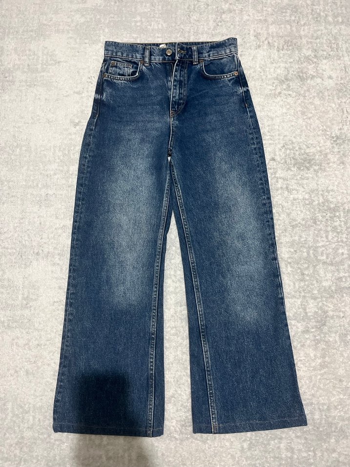 Düğmeli, geniş kesim ve normal midi boyda lacivert kot pantolon. Hafif tie-dye deseniyle günlük kullanıma uygundur.
