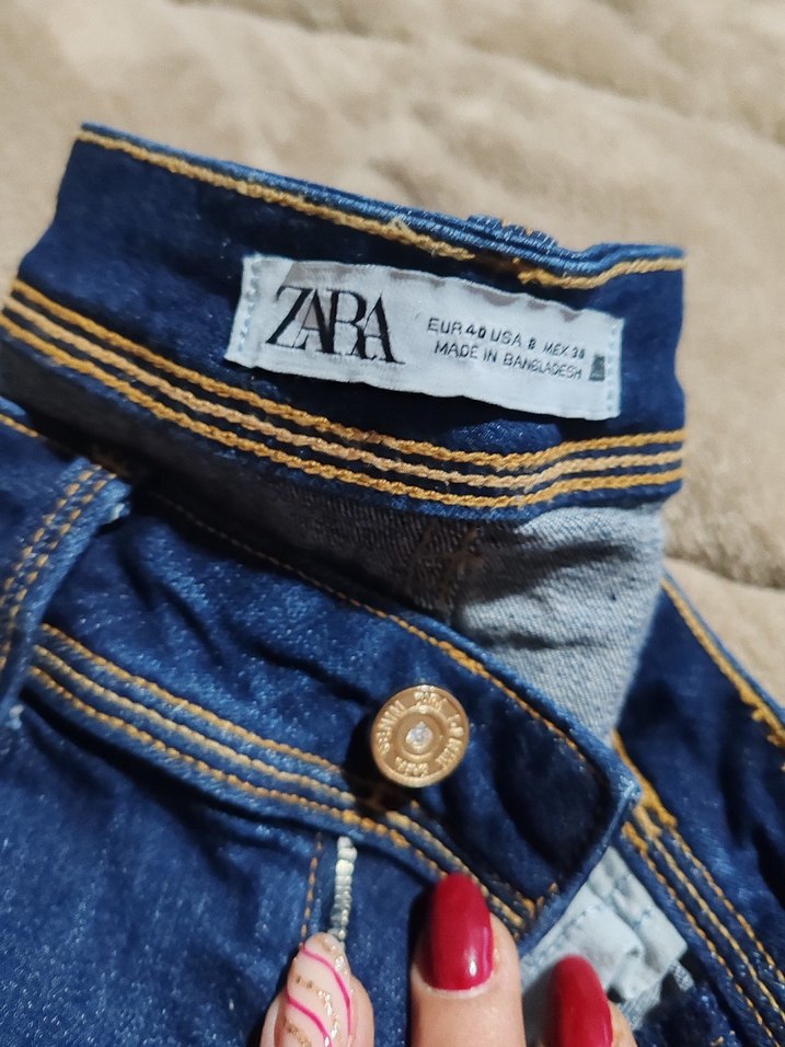 Zara marka, lacivert baskılı, dar kesim, fermuarlı detaylara sahip kadın denim pantolon. Günlük sokak stili için midi boyda, trend bir model. Sadece deneme amaçlı giyildi.