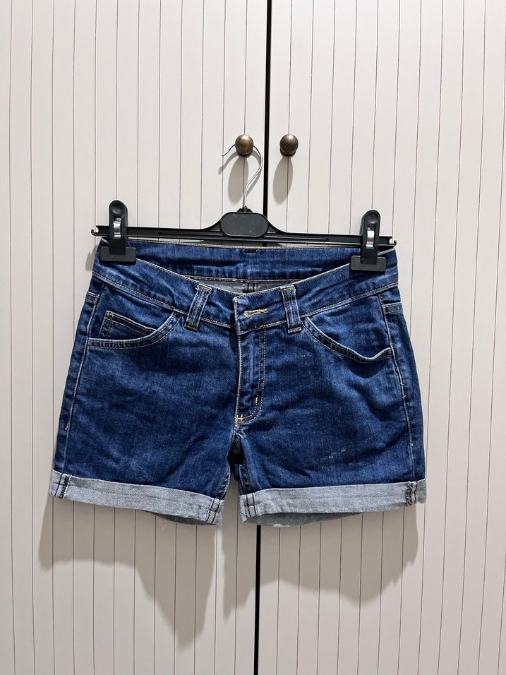Lacivert renkli, bol kesim mini kot şort. Rahat sokak stili ve dış mekan kullanımı için uygun, zahmetsiz şıklık sunar. Çok az kullanıldı gorseldekı gıbı tertemızdır. Beden etiketi yoktur s beden uyar marka temsili
