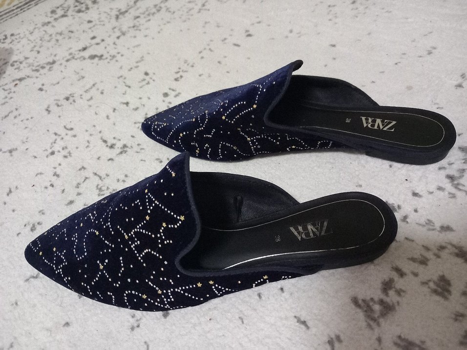 Zara'nın lacivert terlikleri, işlemeli desenler
