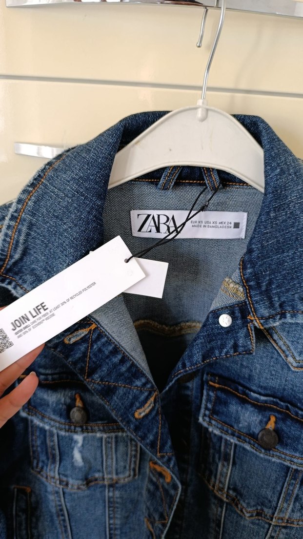 Zara kadınlar için kısa kollu, düğmeli, baskılı desenli ve normal boyda mavi denim ceket. Günlük kullanıma uygundur ve Join Life koleksiyonundandır.