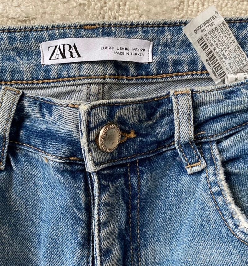 Zara marka, düğmeli, baskılı detaylara sahip mavi midi uzunlukta kadın kot pantolon. Günlük rahat sokak stili için uygun.
