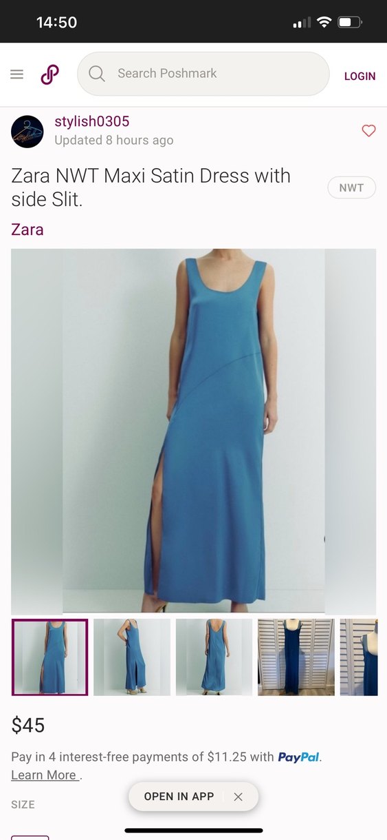 Zara marka, pastel mavi renkli, saten kumaştan yapılmış, kolsuz, V yakalı ve yan yırtmaçlı uzun elbise. Günlük kullanıma uygun, normal kesim. NWT.