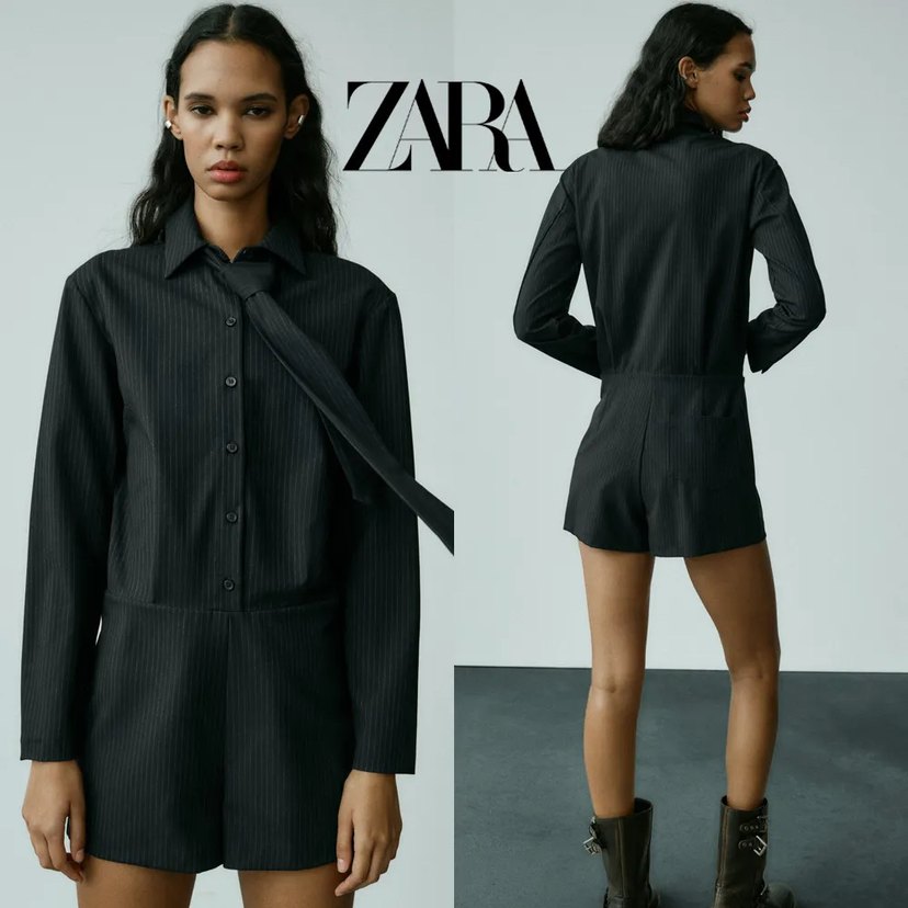 ZARA imzalı siyah mini tulum, uzun kollu ve kemerli/kravatlı. Notlu yaka ve regular fit ile ofis veya sokak stiline uygun.