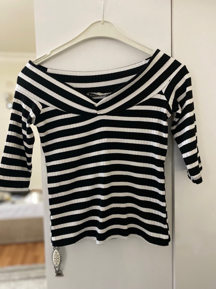 zara Kadın Siyah Beyaz Çizgili V Yakalı Bluz
