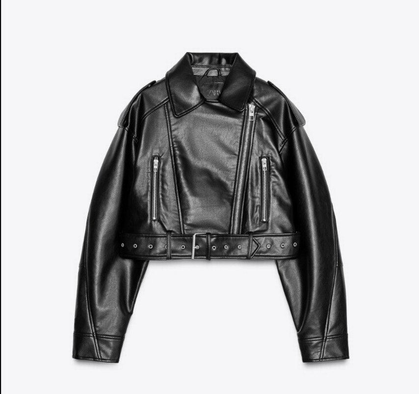 Fitted kesim siyah deri biker ceket, notched lapel yaka, strappy kollar ve kemerli bel ile grunge punk tarzını yansıtıyor. Günlük kullanım için uygun. Orjinal ve etiketli üründür