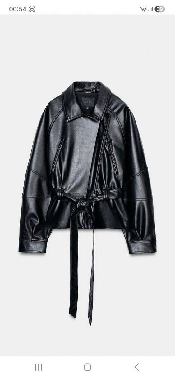 Siyah deri biker ceket, kemerli ve kesik yakalı. Askılı kollara ve normal kesime sahip, ofise uygun.