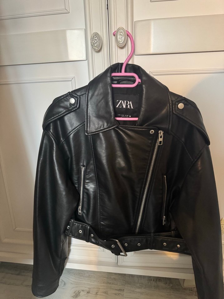 Crop ve kemerli, siyah deri ceket. Notch yaka, strappy kollu, günlük kullanım için uygun. Marka: ZARA. En fazla üç kez giyildi elim gitmediği için satıyorum.