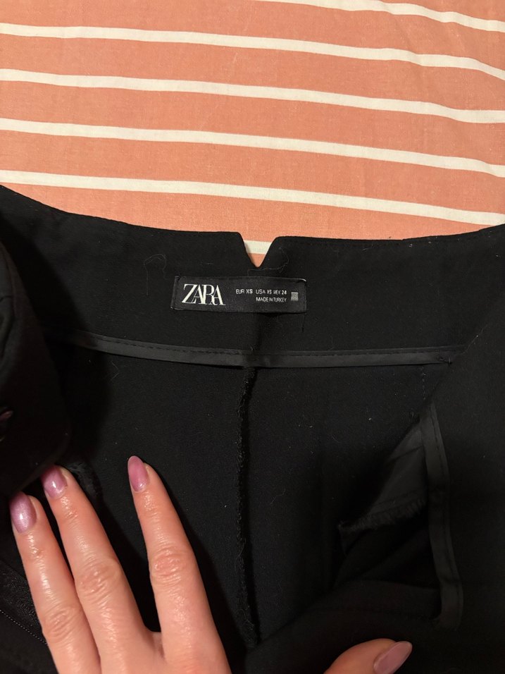 ZARA markalı, fermuarlı, baskılı siyah kumaş pantolon. Standart boy, dar kesim ve günlük sokak stiline uygun.