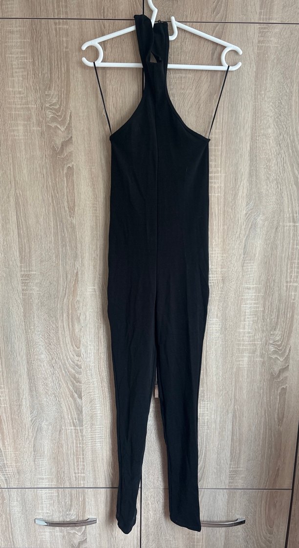Siyah, yakalı, kolsuz dar kesim dar paça tulum