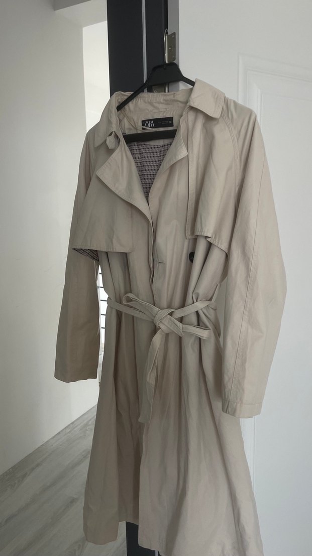 Keten kumaştan, belden kuşaklı bej midi trençkot. Uzun kollu, yakası kesik ve bol kesim, günlük sokak stili için uygun.