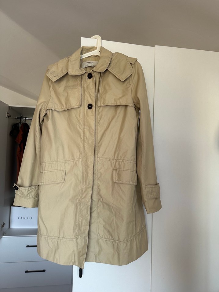 Bej renkli, düğmeli midi uzunlukta kadın trençkot. Rahat kesimli, yakalı ve uzun kolludur, günlük kullanıma uygundur. Zara marka S beden kusuru yoktur