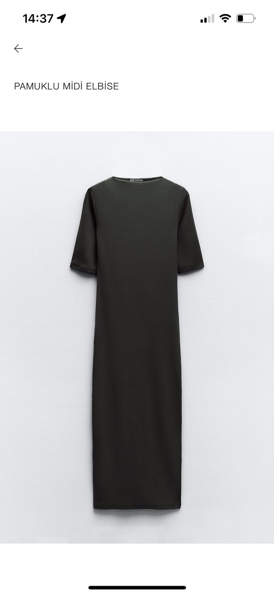 uzun elbise, kısa kollu ve kayık yaka tasarıma sahiptir. Düz, sentetik kumaştan üretilmiş, günlük kullanıma uygun minimalist kesimlidir.