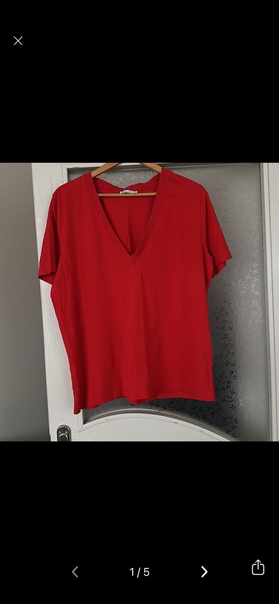 Kırmızı parlak renkte, V yakalı ve kısa kollu kadın keten tişört. Bol kesim ve günlük kullanıma uygun rahat bir şıklık sunar. İki omuz arası 44 cm, kol uzunluğu 21 cm, uzunluk 68 cm