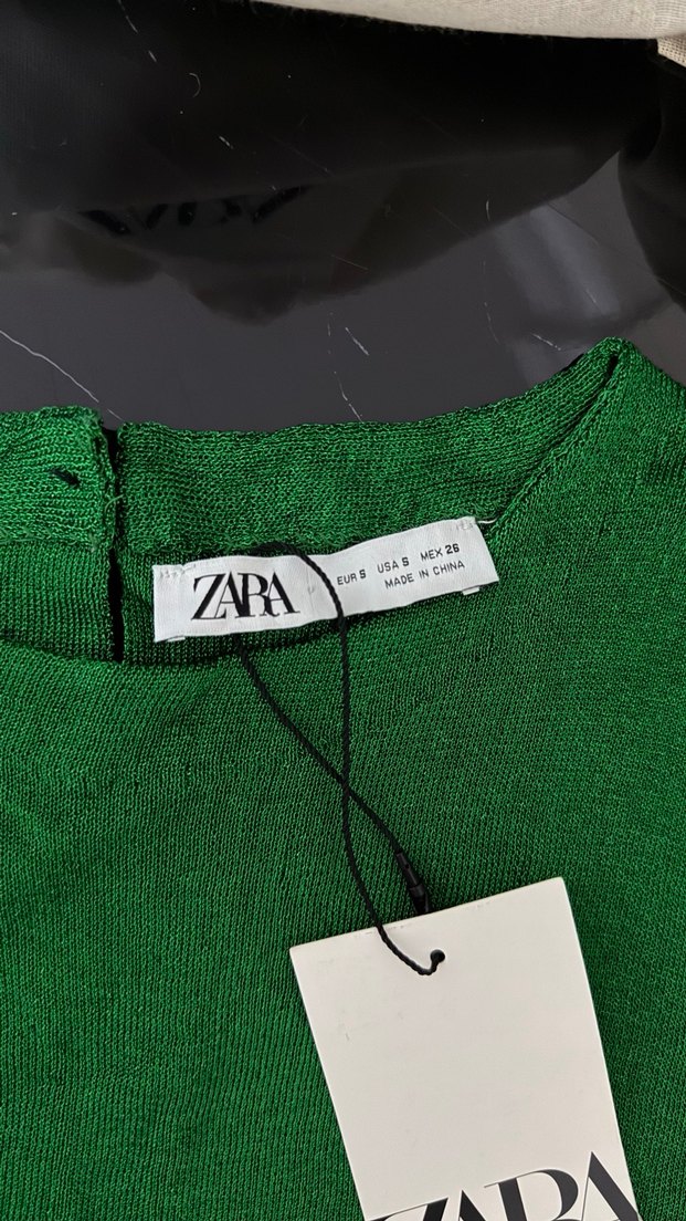 Zara marka, fermuarlı, uzun kollu ve bisiklet yaka kadın triko. Canlı koyu yeşil renkte, baskılı ve midi uzunlukta, sokak modasına uygun.