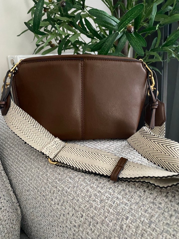 Kahverengi deri, kemerli tasarıma sahip kadın çanta. Geniş, desenli askısıyla çağdaş ve Paris tarzı bohem bir görünüm sunar.